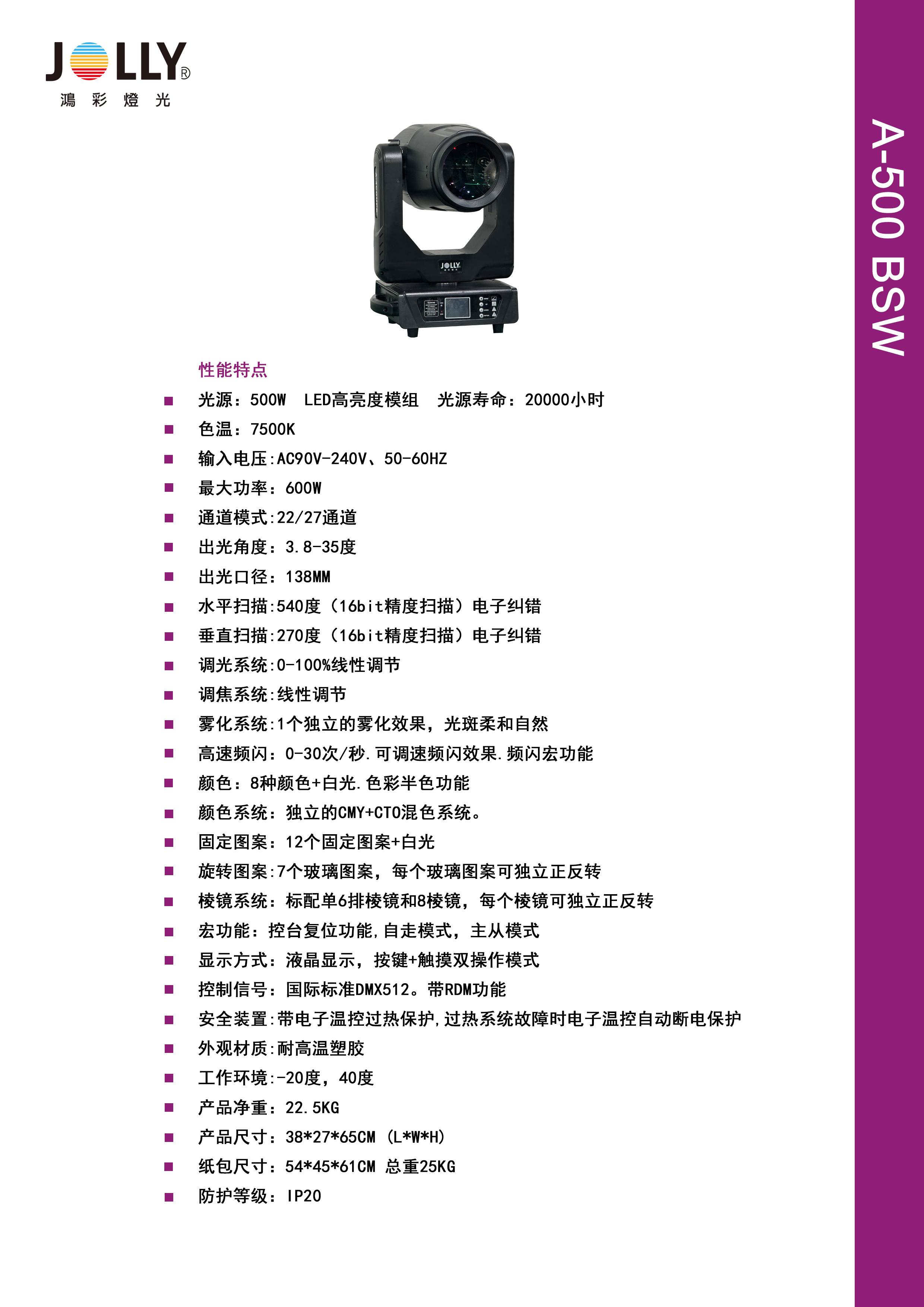 光源:500W LED高亮度模组 光源寿命:20000小时
