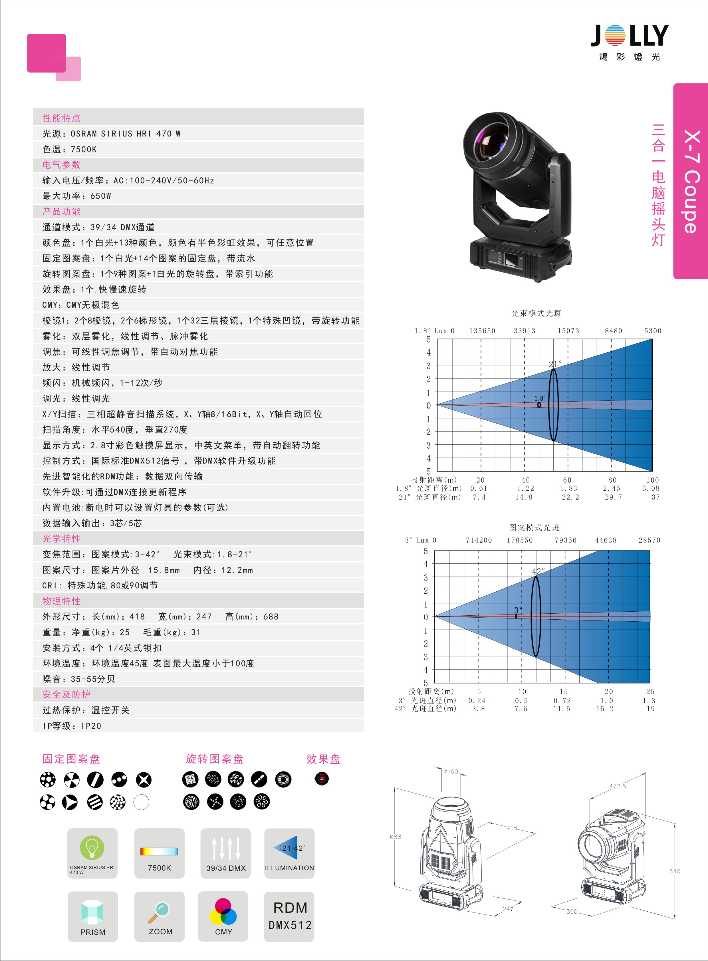 变焦范围:图案模式:3-42° 光束模式:1.8-21°